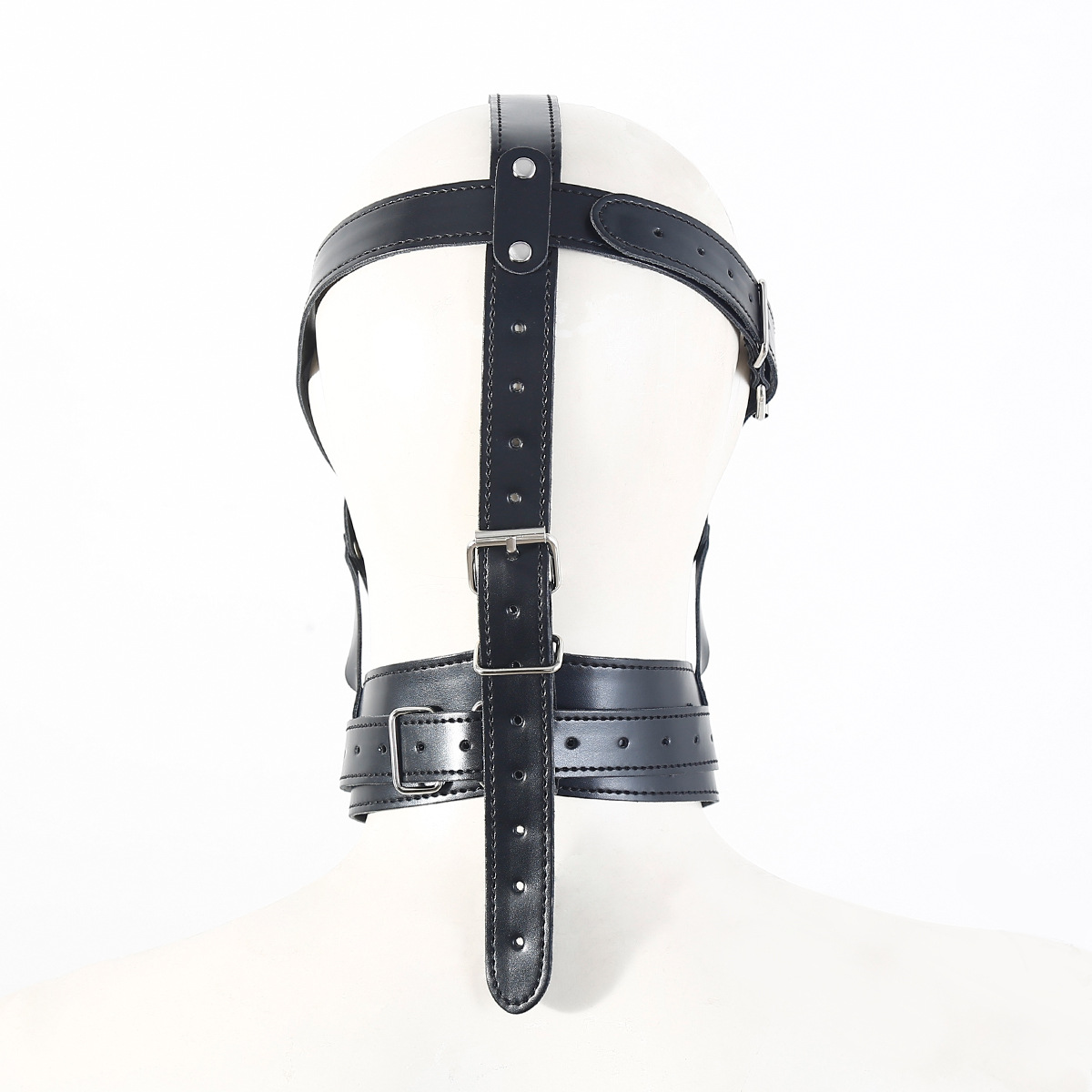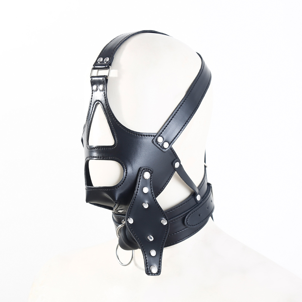 PU Leather harness head hood mask with mouth penis plug and neck collar.